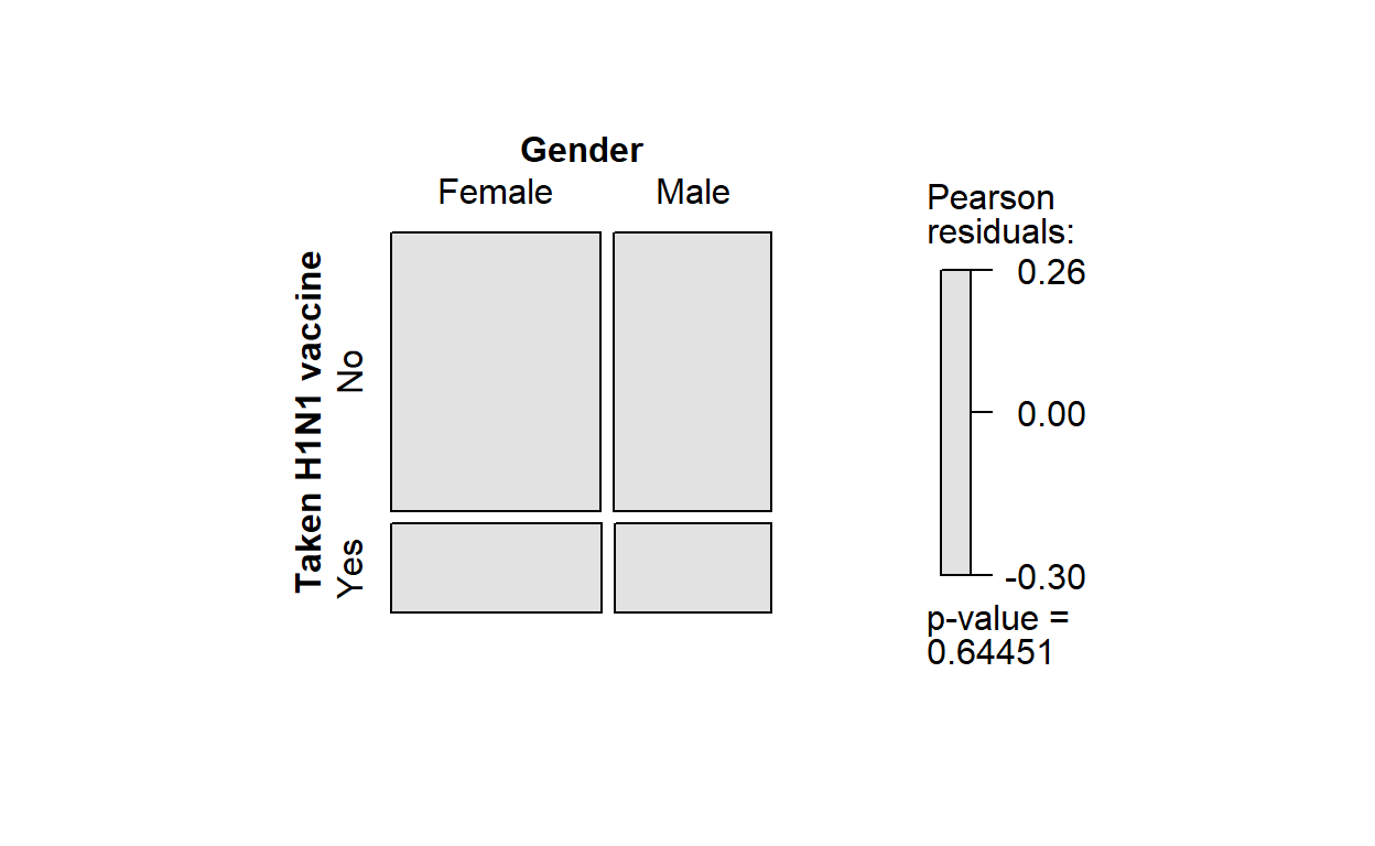 As a contrast, the plot for gender is below, and is greyscale. This implies that gender is not a significant indicator of whether an individual takes the vaccine.