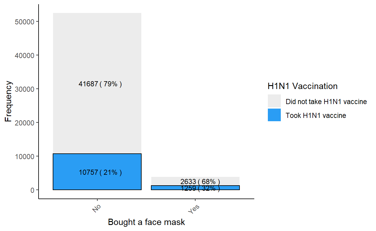 The colors imply that there is a relationship between the input variable and target variable. In this case, survey respondents who bought a face mask are more likely to have taken the H1N1 vaccine. The code and resultant plot are as follows: